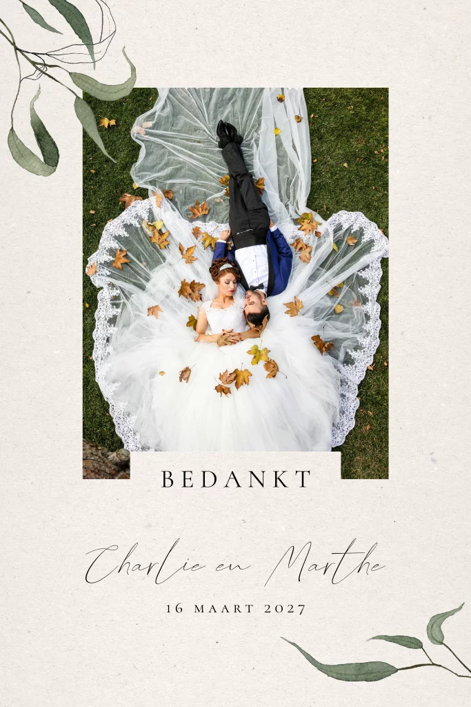 Bedanktkaart bruiloft met geschetste takjes en groene bladeren. De foto op de voorzijde vervang je gemakkelijk voor een eigen foto. Bij dit ontwerp adviseren we Oud Hollands papier.