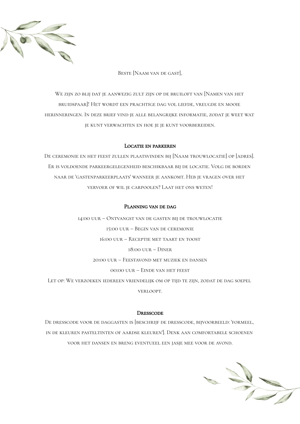 Brief van de ceremoniemeesters voor bij de trouwkaart. In A4 formaat waarbij voor- en achterzijde bewerkbaar zijn met eigen tekst en afbeeldingen.