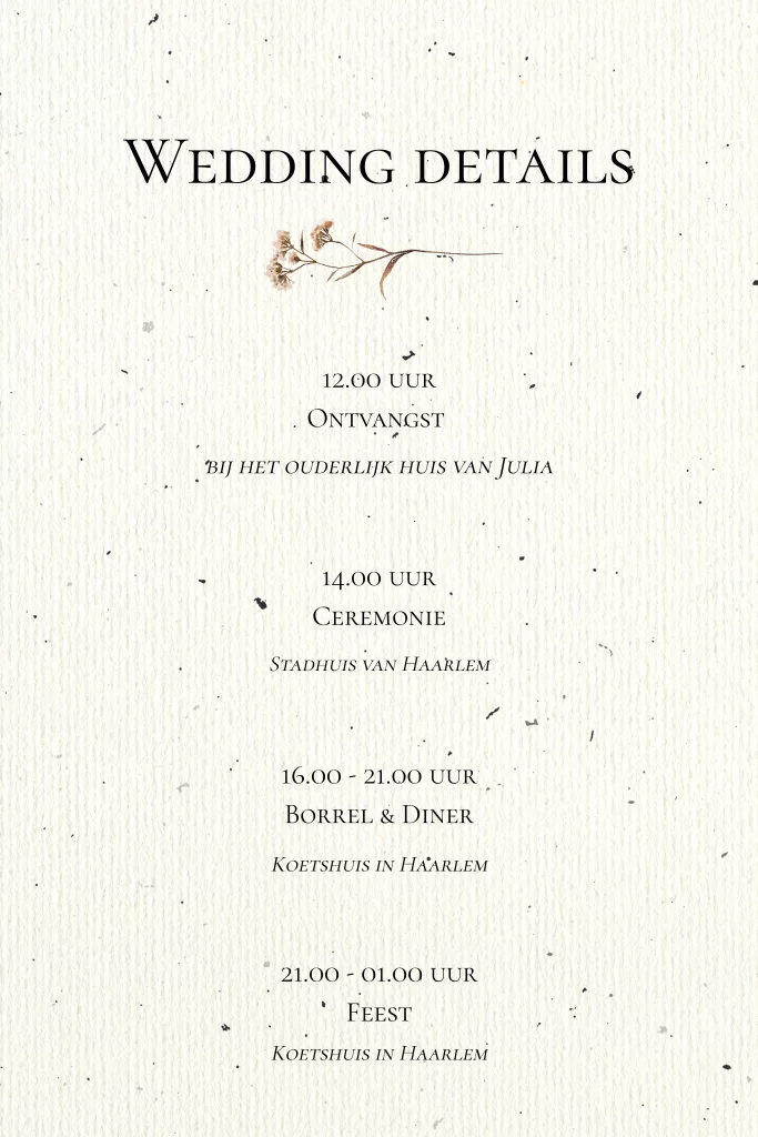 Dagprogramma bruiloft met gevlekte achtergrond en subtiel roze veldbloem.