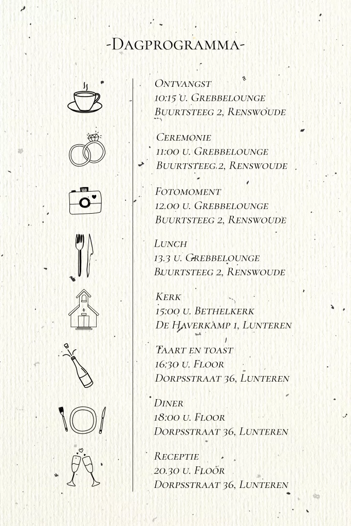 Een dagprogramma op A6 formaat met diverse bruiloft icoontjes. De achtergrond met zwarte vlekjes is eenvoudig te verwijderen indien gewenst.