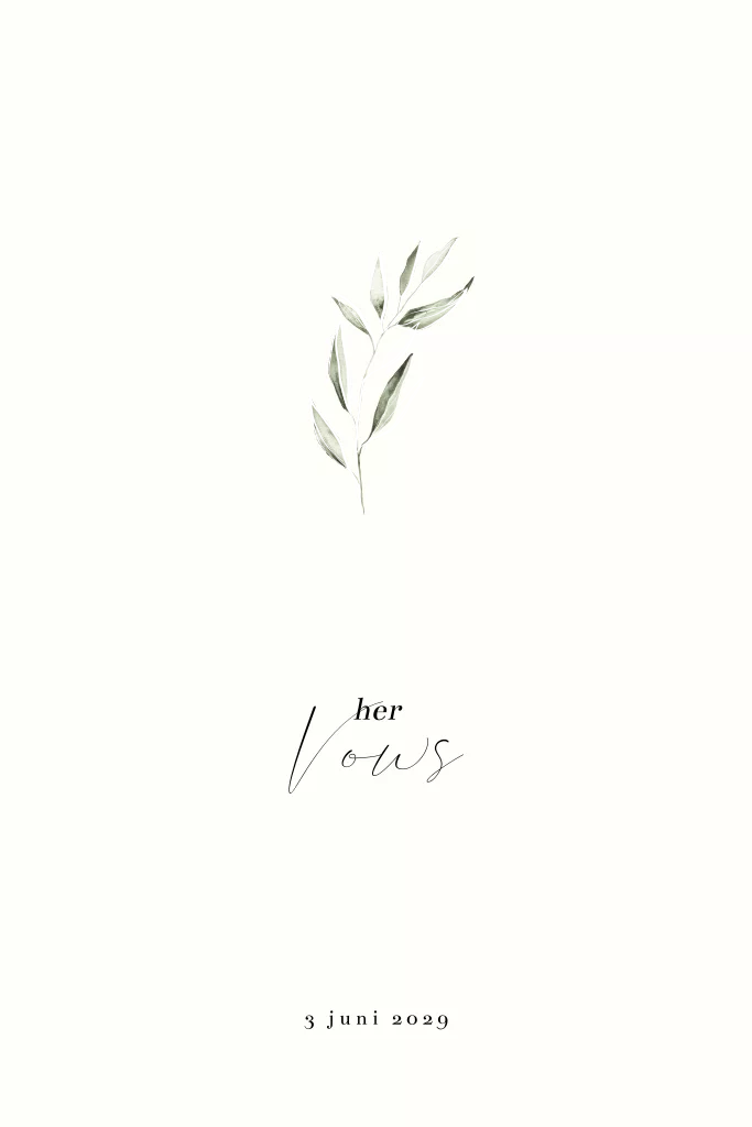 Geloftenboekje voor his en her vows met een olijftakje. Rondom het olijftakje zitten goudfolie lijntjes. Ook passend wanneer de trouwlocatie in het buitenland is, zoals Italië of Spanje.“Wij zijn heel tevreden met de service van Studio Dijs. We waren op zoek naar een iets bijzonderder kaartje, en bij Studio Dijs vonden we precies wat we zochten. Zowel de proefdruk als de daadwerkelijke geboortekaartjes waren snel geleverd.”