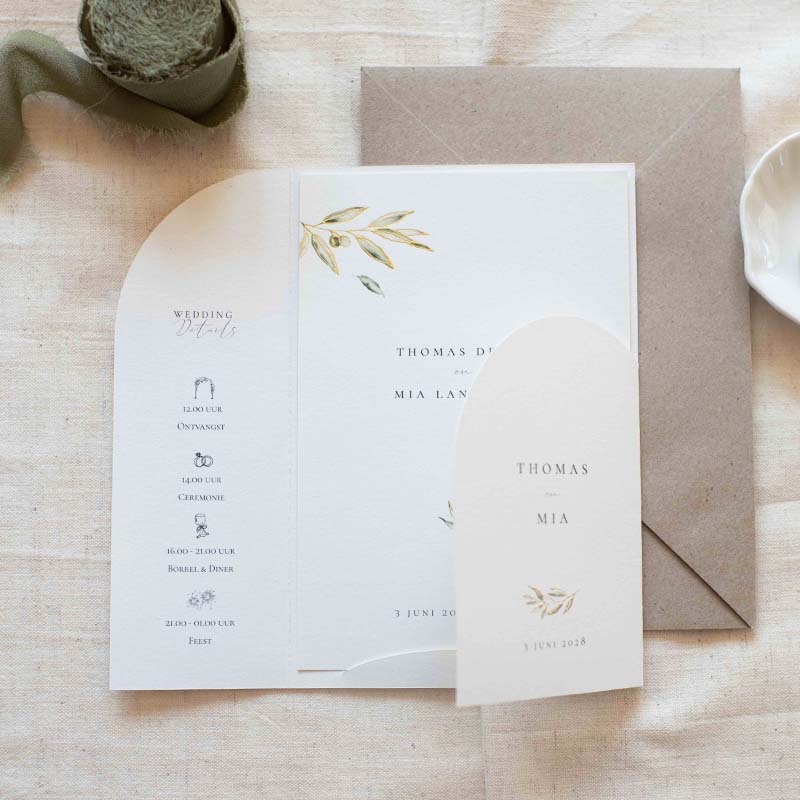 Insteek mapje voor de trouwkaart in Mediterrane stijl met olijftakjes en goudfolie details. Ontwerp zelf dit mapje met tekst en info naar eigen wens in de online ontwerptool. Kies de bijpassende trouwkaart om in dit mapje te steken. Let op: kies bij deze set envelopmaat 13,5 x 20 cm wanneer je de enveloppen los van het bestelproces bestelt.