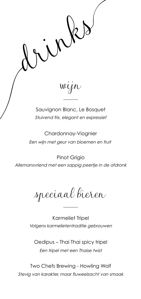 Heb jij bijzondere wijnen en/of bieren tijdens het diner? Geef ze een eigen podium met de speciale drankenkaart!