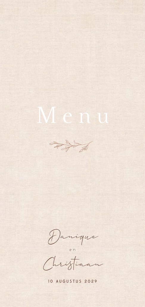 Menukaart voor het huwelijksdiner. Met linnen look achtergrond, goudfolie tekst en fijne takjes als detail.Proefdruk | vanaf 2,50 | |||||||||||||||