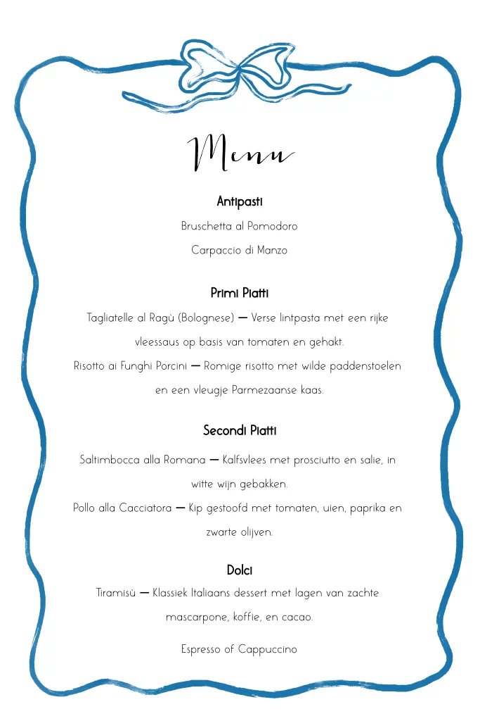 Menukaart voor een Italiaanse bruiloft in mediterraanse blauwe kleur. Met een golvend frame en romantische strik. Op de voorzijde van de kaart staat het menu en op de achterkant is er ruimte voor een uitleg over de wijnen.
