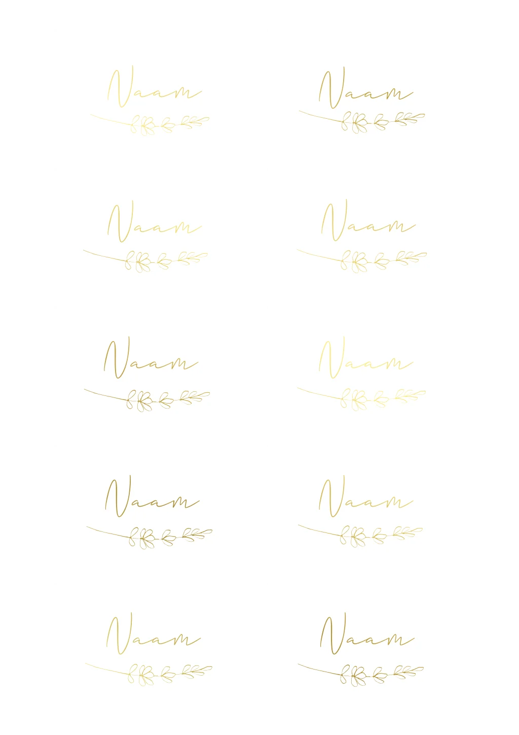 Naamkaartjes voor het diner of de ceremonie op de bruiloft. Met goudfolie naam en subtiel takje in lijntekening.