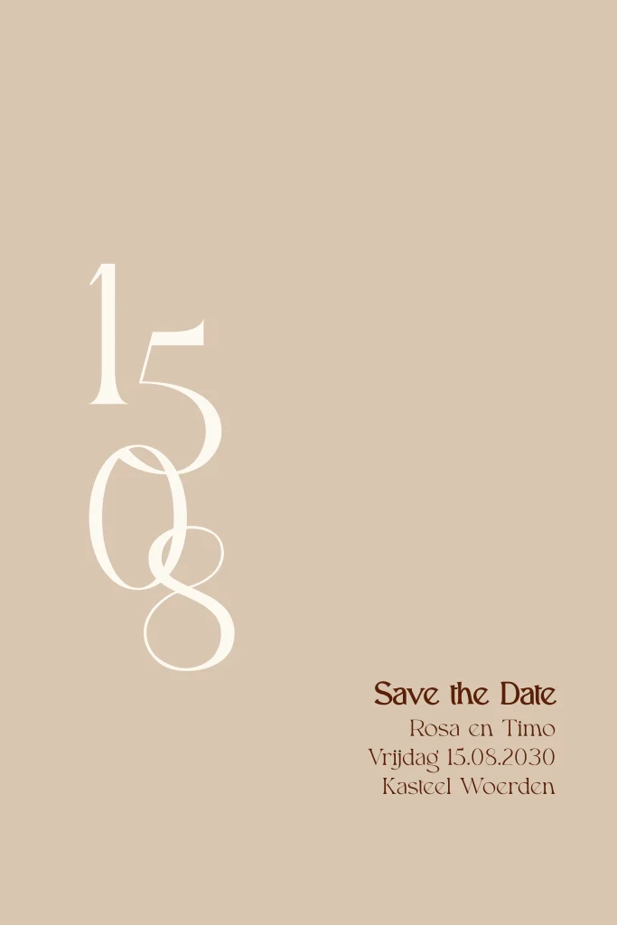 Strakke en moderne Save the Date kaart in een warme zandkleur. De datum is sierlijk vormgegeven met in elkaar doorlopende cijfers. Pas de kleuren eenvoudig aan in de online editor.