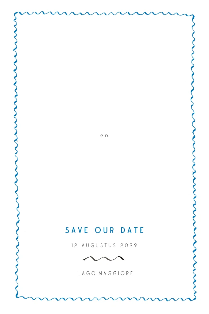 Save the Date voor een echte beach wedding. Met blauwe golfjes en goudfolie namen op de voorzijde. Passend voor bruiloften in de zomer, bij zon, zee en strand en bruiloften over de grens in bijvoorbeeld Italië, Frankrijk of Spanje.