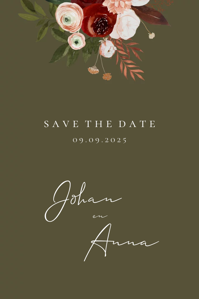 Save the Date kaart in een warm groene kleur met een prachtige bloemenzee.