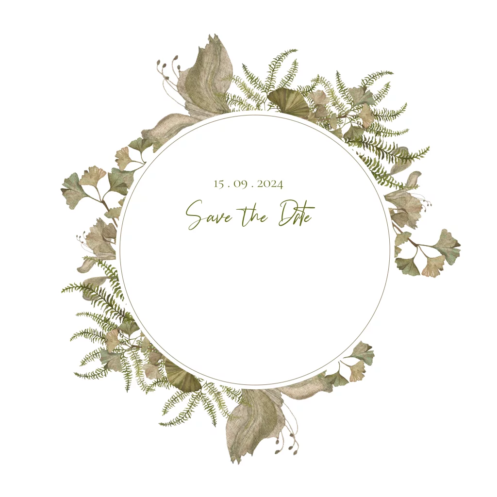 Save the Date kaart met een krans van groene en gedroogde takjes. De namen op de voorzijde staan in goudfolie.