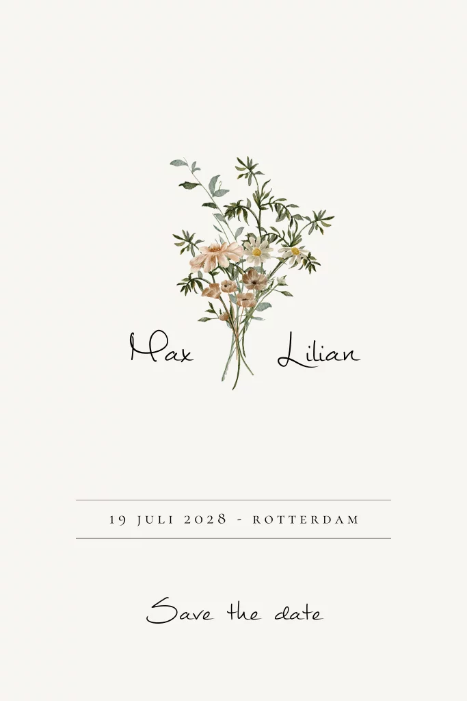 Save the Date kaart met een romantisch boeket gevuld met prachtige takjes en bloemen.