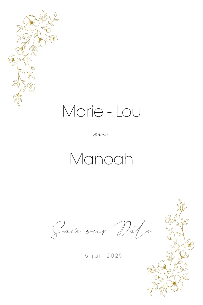 Romantische Save the Date met bloemenkrans in lijntekening.