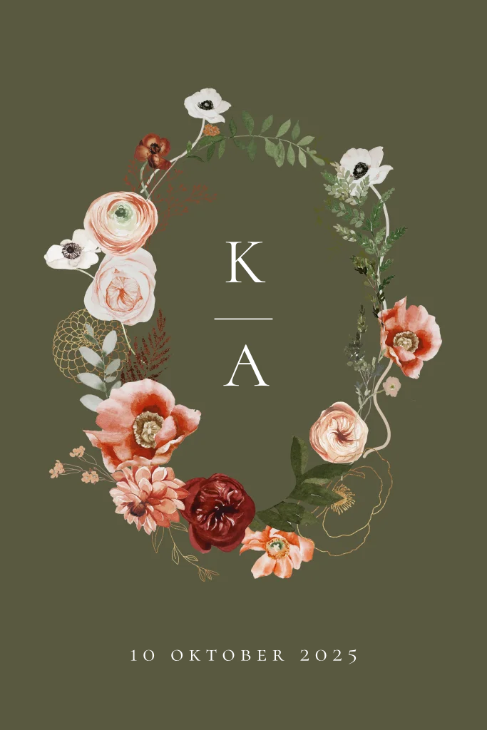 Save the Date kaart met warme kleuren en bloemen in prachtige aardetinten.