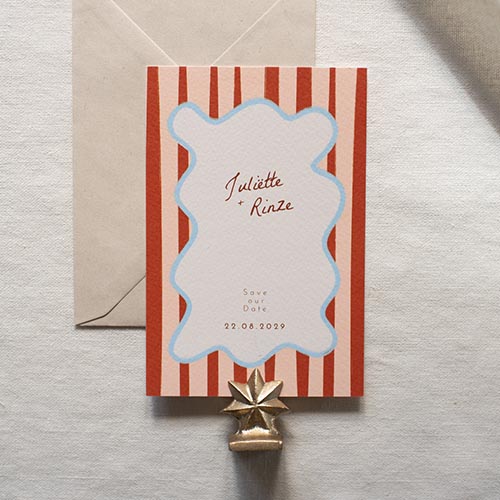 Vrolijke Save the Date met golvende rand en streepjes patroon. In de kleuren perzik, donker oranje en babyblauw. Een leuke en vrolijke Save the Date voor zomerse bruiloften. Ook voor bruiloften in het buitenland, zoals Italië, Frankrijk of Spanje.