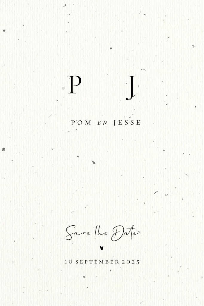 Save the Date kaart met zwarte vlekjes op de achtergrond. Het takje op de voorzijde staat in goudfolie. Bij dit kaartje adviseren we linnen papier.