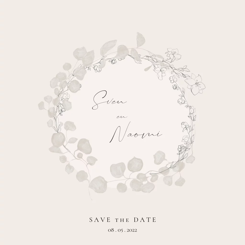 Save the Date kaart in lichte poeder en zandkleuren. Bekijk ook de bijpassende trouwkaart in de trouwkaarten collectie!