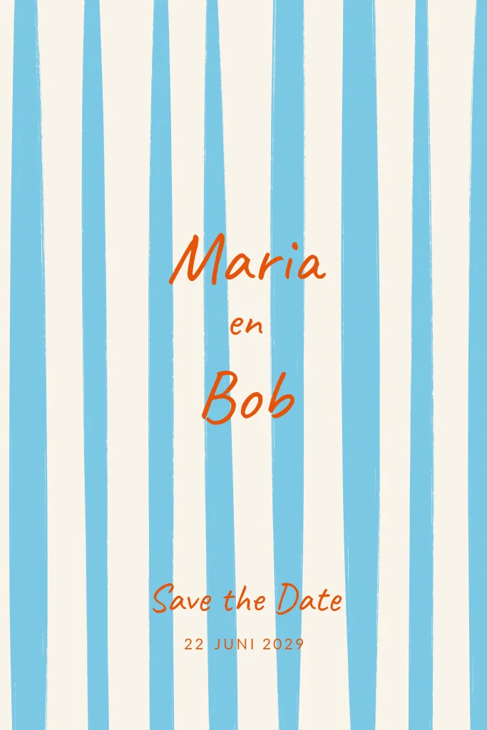 Vrolijke Save the Date kaart met gestreept patroon. De kaart heeft zomers blauwe en oranje kleuren.
