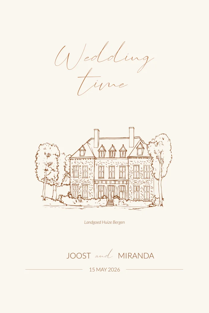 Save the Date kaart met lijntekening van trouwlocatie Landgoed Huize Bergen in Vught. Bekijk bij de afbeeldingen 'Trouwlocaties' veel meer andere lijntekeningen of mail ons voor een illustratie van jullie trouwlocatie.