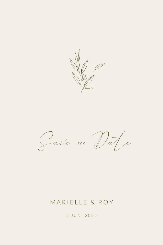 Romantische en mediterraanse Save the Date kaart met bijpassende olijftakjes. De namen zijn sierlijk vormgegeven. Pas de kleuren eenvoudig aan in de online editor.