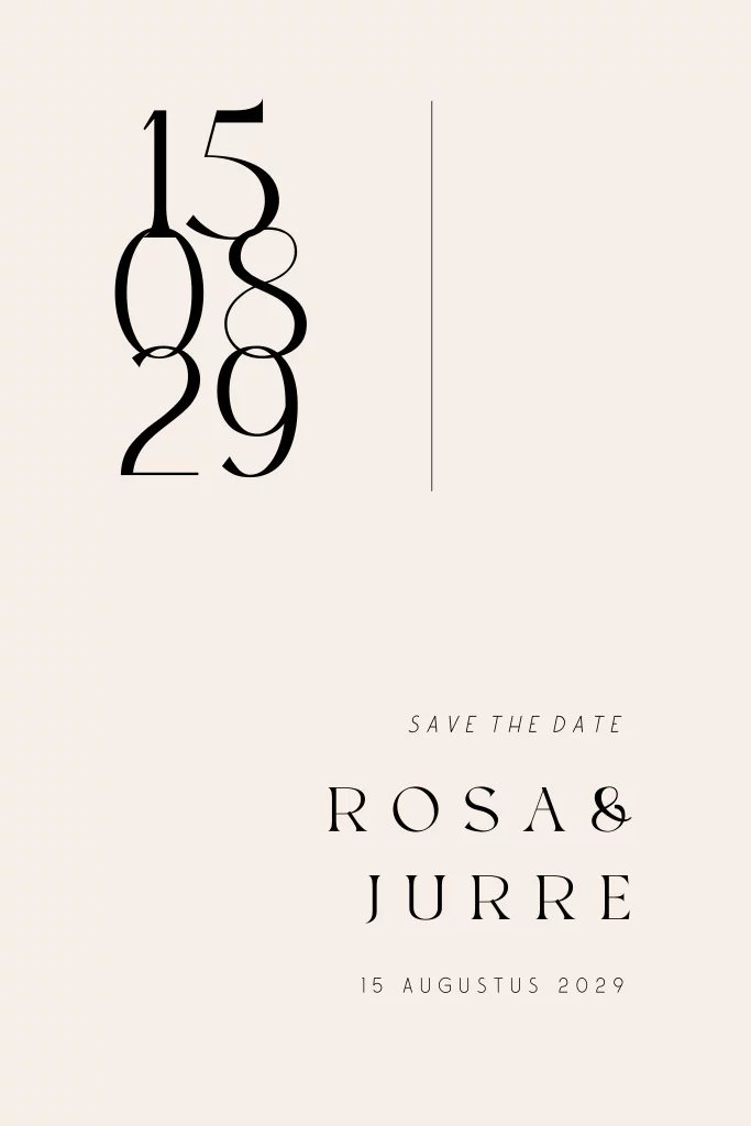 Minimalistische en moderne Save the Date kaart met zwarte opdruk en licht beige zandkleur achtergrond. De datum is sierlijk door elkaar verweven voor een uniek effect.