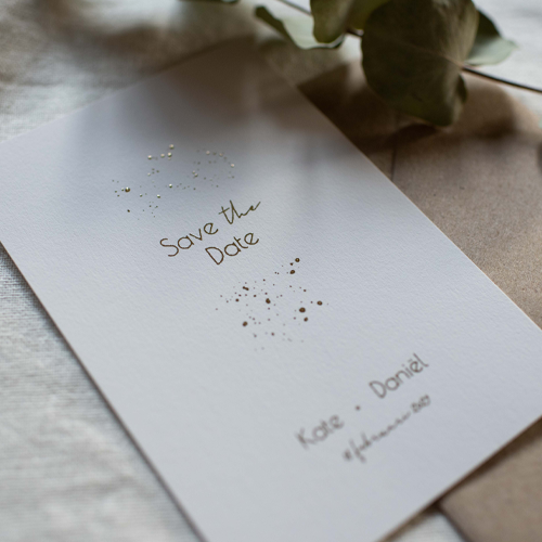 Save the Date kaart goudfolie vlekjes. De namen en tekst staan ook in goudfolie. Bewerk het kaartje makkelijk zelf in de online editor.