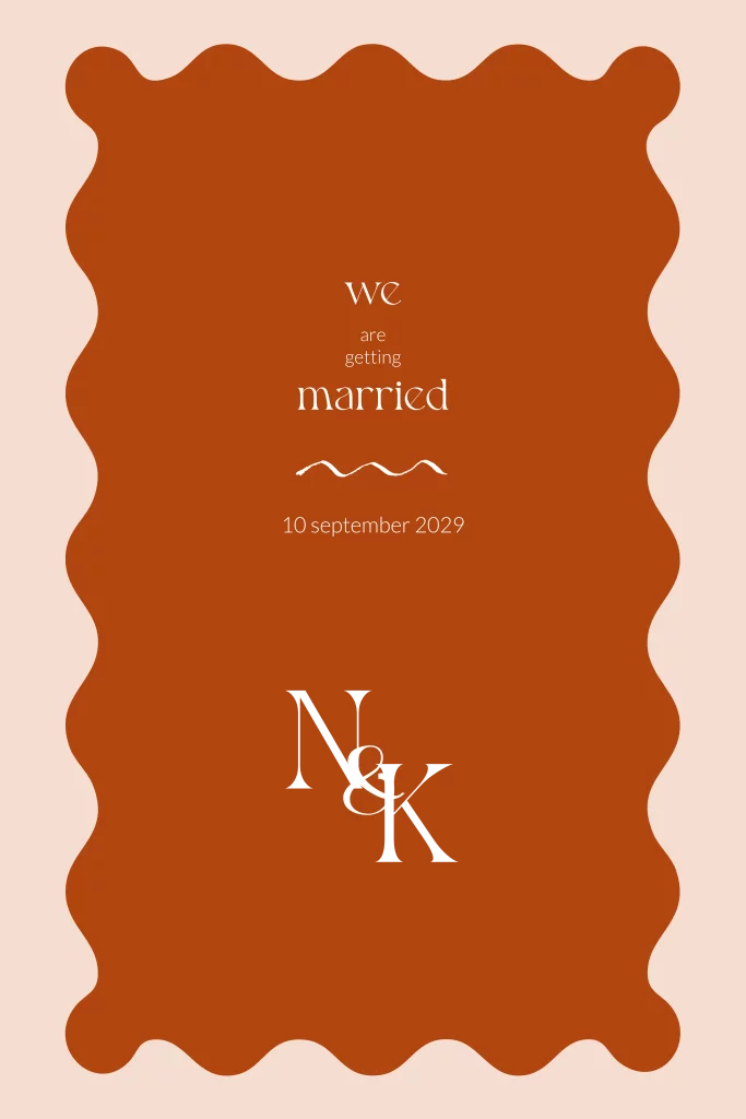 Een hippe Save the Date met golvende rand en hippe, felle oranje kleuren. De initialen op de voorzijde staan in goudfolie. Maak indruk met deze originele Save the Date!