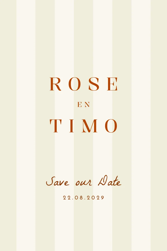 Vrolijke Save the Date strepen patroon in een geelgroene kleur. De tekst is in terracotta bruin. Een originele kleurencombinatie passend bij een unieke en hippe bruiloft.