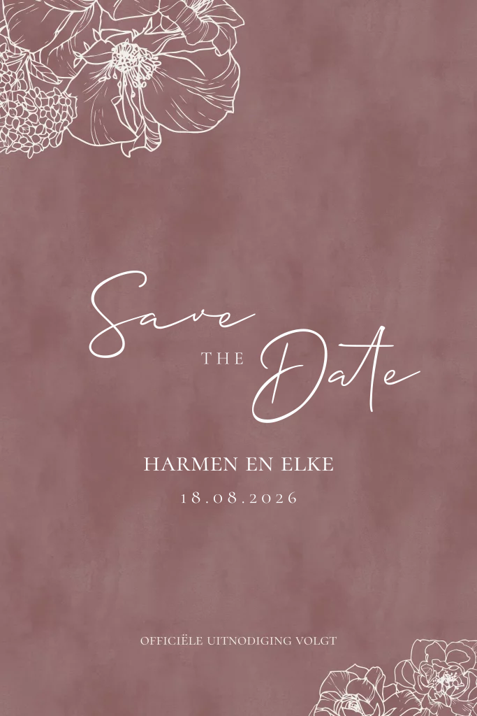 Save the Date kaart met een mooie paars/ roze kleur in velvet look. Een een prachtige bloemenzee. Op de voorzijde is de kaart voorzien van goudfolie tekst.