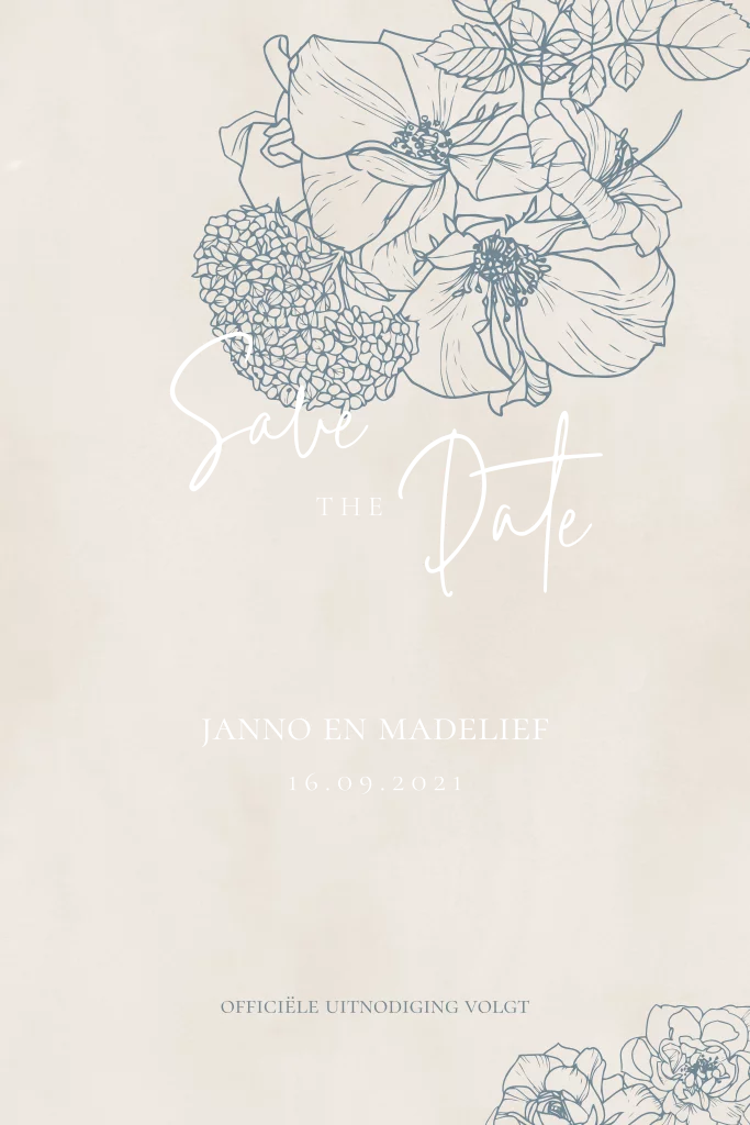 Save the Date zandkleur bloemenzee blauw