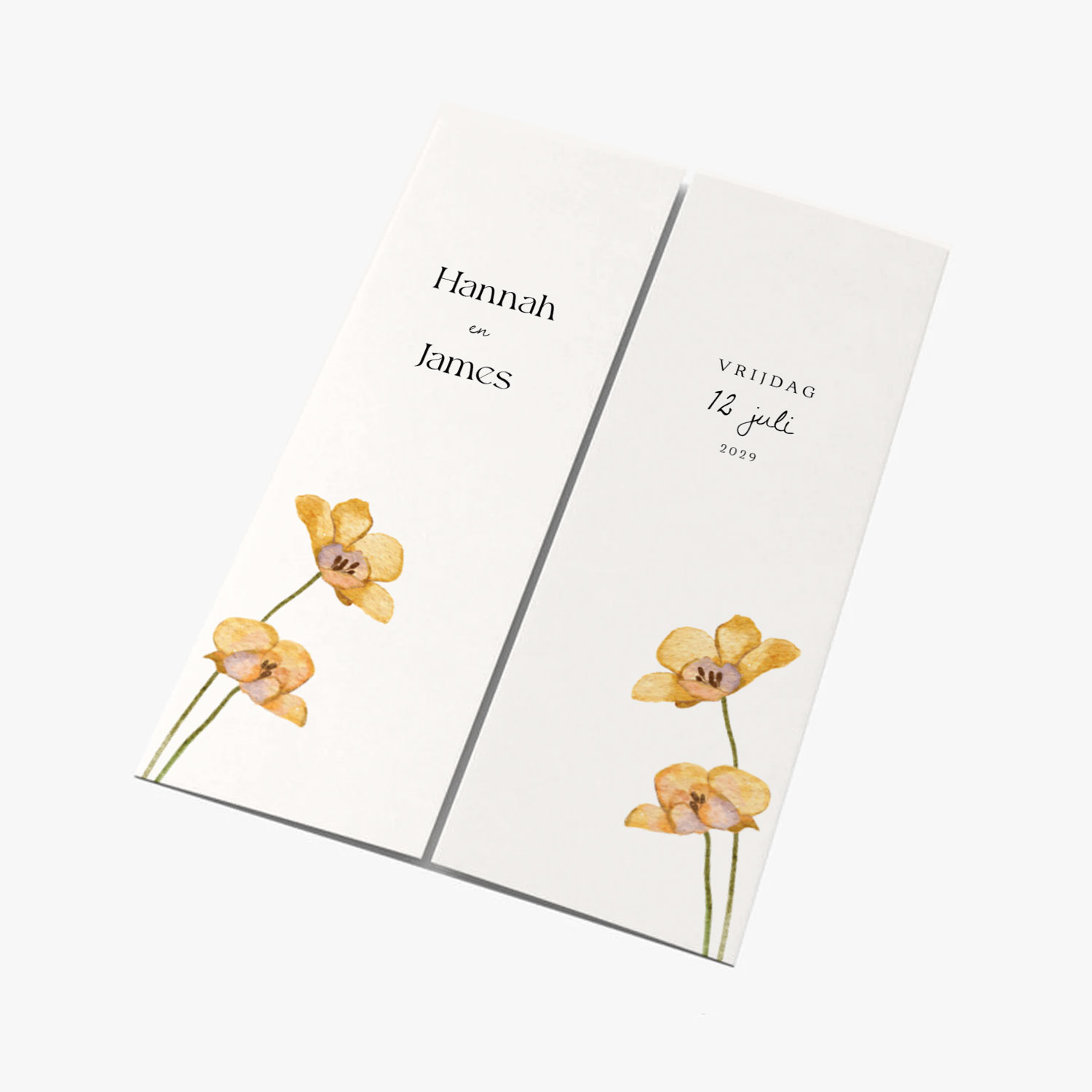 Trouwkaart met luikvouw. Met vrolijke, gele bloemen.