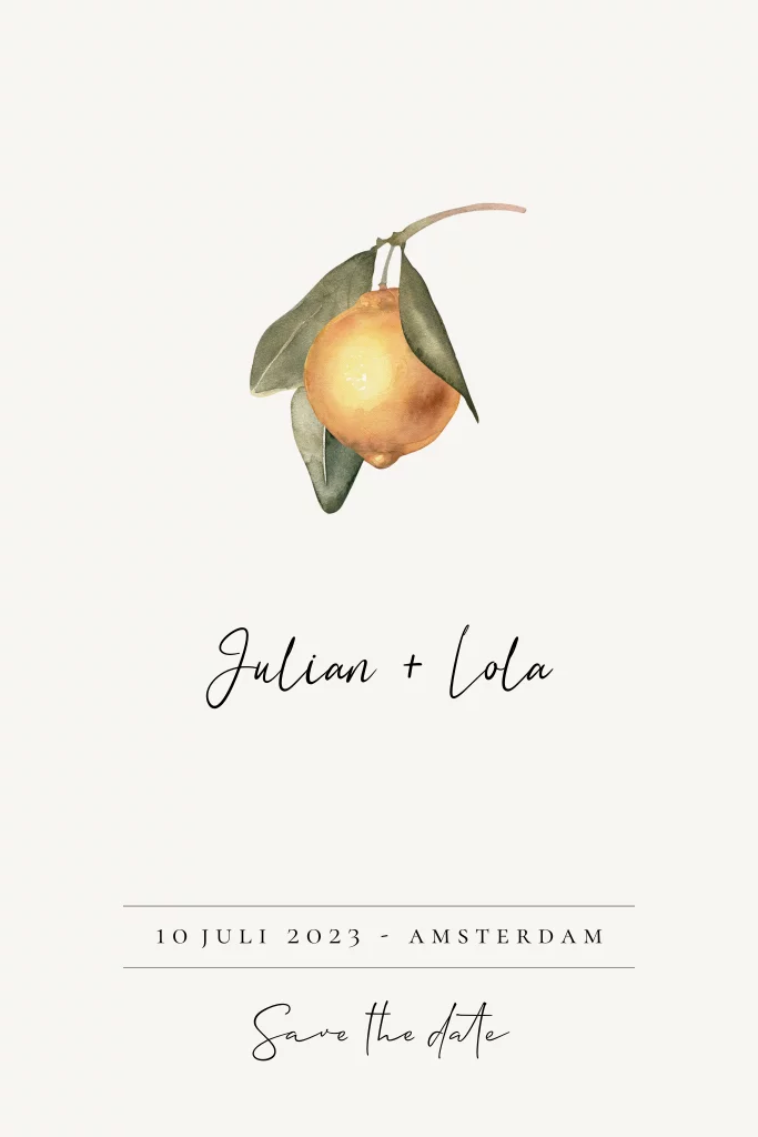 Save the Date kaart met een minimalistische citroen op de voor- en achterzijde. Ook verkrijgbaar in een bijpassende trouwkaart. Bij dit ontwerp adviseren we Oud Hollands papier.