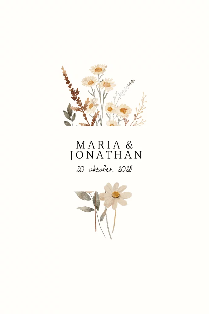 Botanische trouwkaart vol aardekleuren veldbloemen. Deze trouwkaart past perfect bij een botanische bruiloft. Of bruiloft in de herfst of winter.