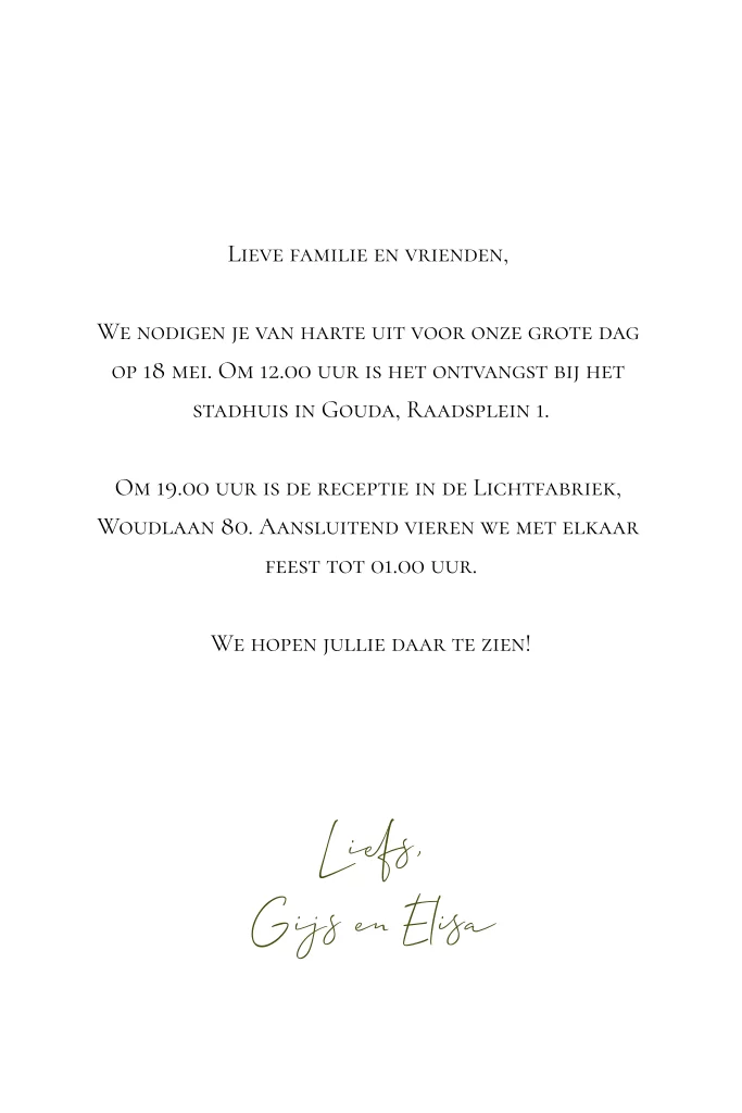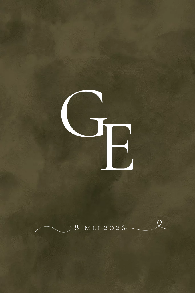 Een chique trouwkaart met watercolor groene achtergrond en goudfolie letters op de voorzijde