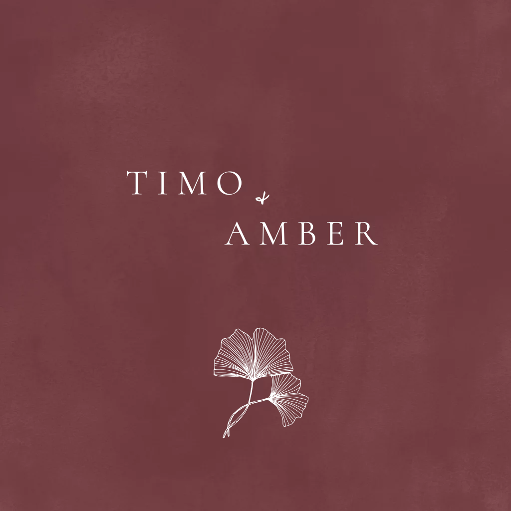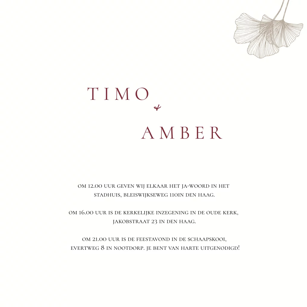 Trouwkaart in aubergine kleur met een Ginkho blad. De voorzijde is voorzien van goudfolie. Deze kaart komt mooi tot zijn recht op linnen papier.