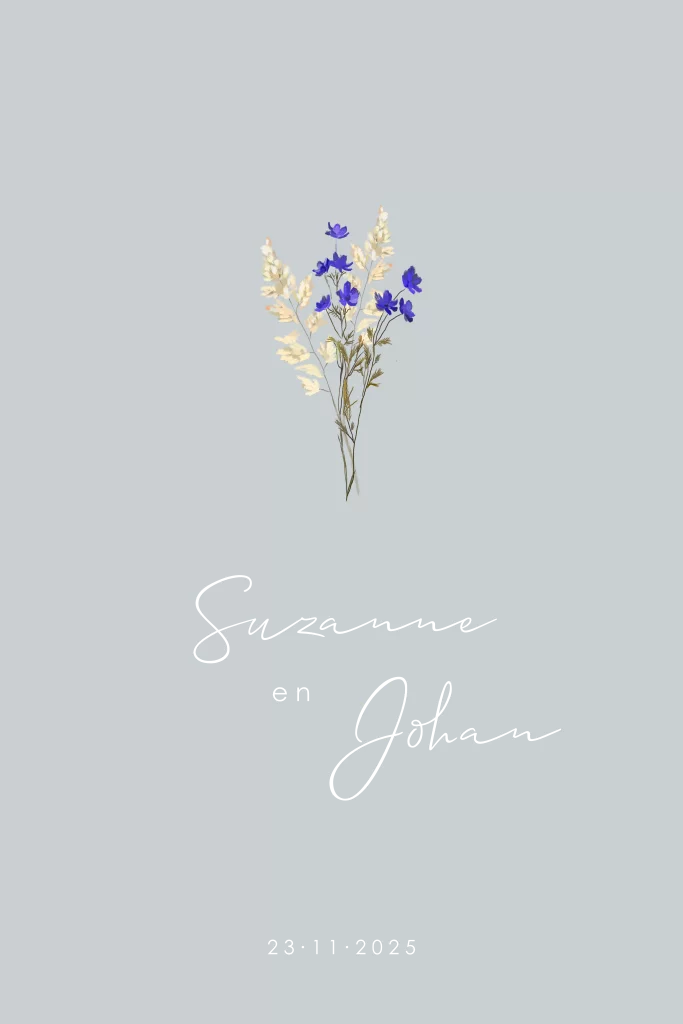 Trouwkaart bloemen zand paarsblauw