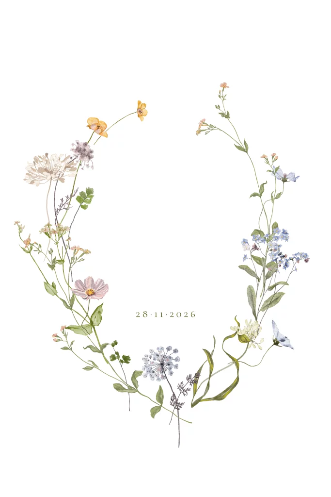 Trouwkaart met fijne bloemenkrans in pastelkleuren.