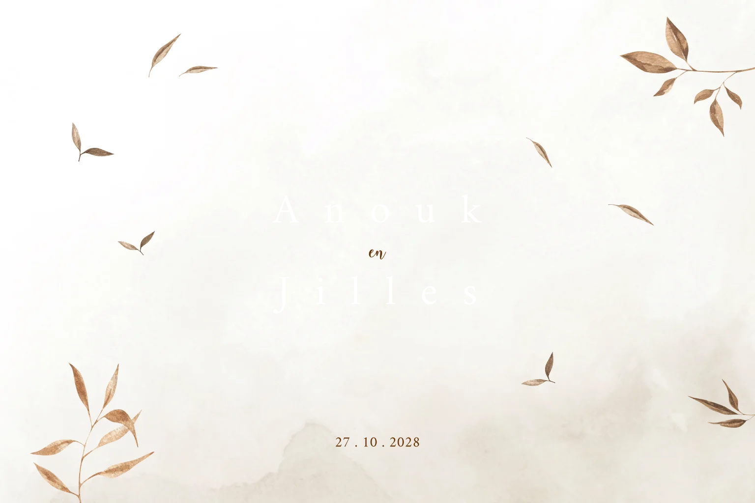 Trouwkaart met warme bruine kleuren en takjes in brons kleurige tonen.