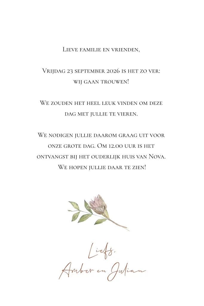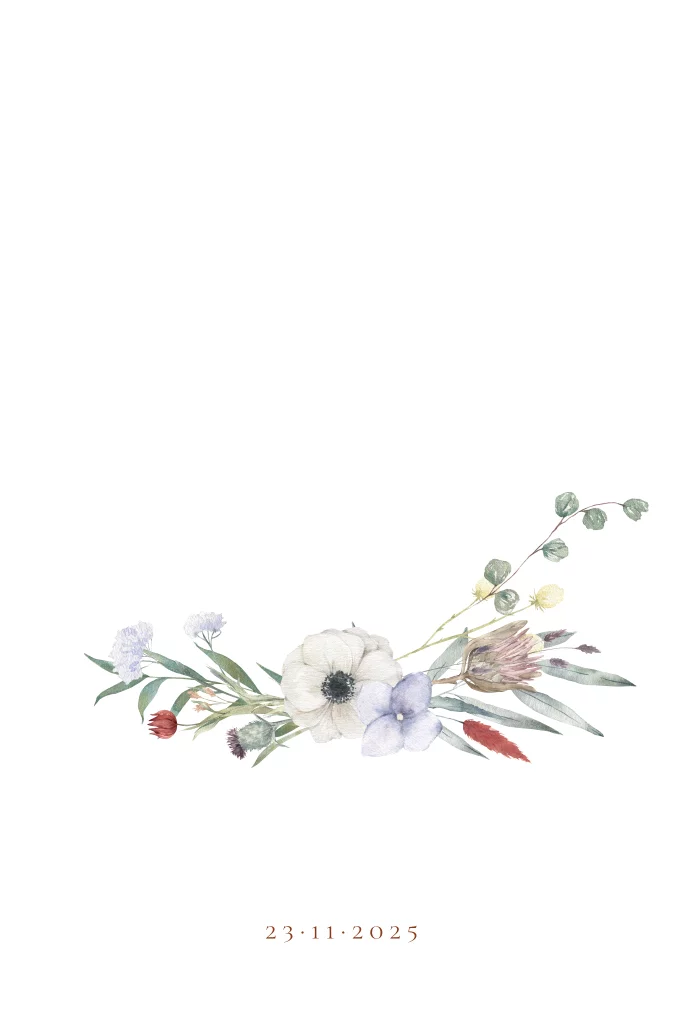 Trouwkaart met een prachtige bloemenkrans in een goudfolie cirkel. De letters op de voorzijde zijn ook voorzien van goudfolie.