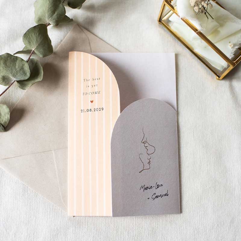 Deze tweeluik trouwkaart heeft een rustige eco look achtergrond en op de voorzijde een stijlvolle lijntekening van het bruidspaar. Minimalistisch, tijdloos en toch helemaal van nu.