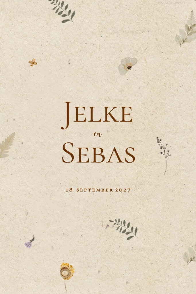 Een romantische trouwkaart met een fijne eco structuur achtergrond. Gecombineerd met prachtige droogbloemen. Deze kaart combineer je mooi met de bijpassende kalkpapier voorzijde die ook voorzien is van dezelfde blaadjes en goudfolie namen.