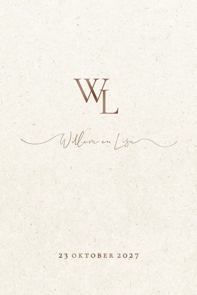 Minimalistische trouwkaart met bruin hoogglans opdruk op de voorzijde. De achtergrond heeft een eco look met kleine vezeltjes voor een extra mooi effect.