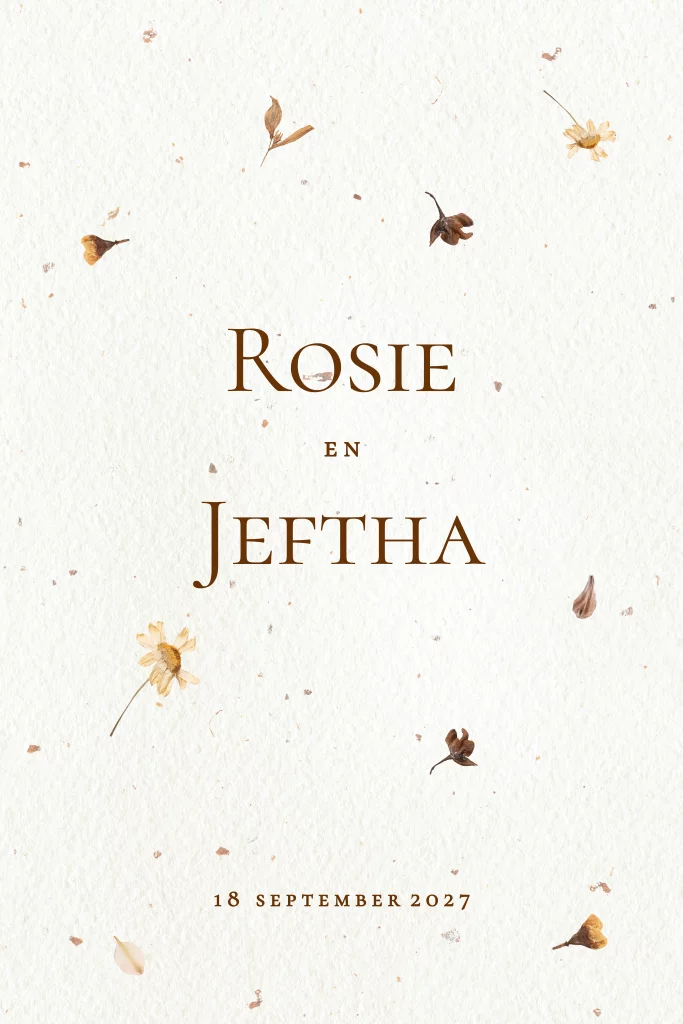 Een minimalistische en unieke trouwkaart met een gevlekte structuur achtergrond. Gecombineerd met prachtige droogbloemen.