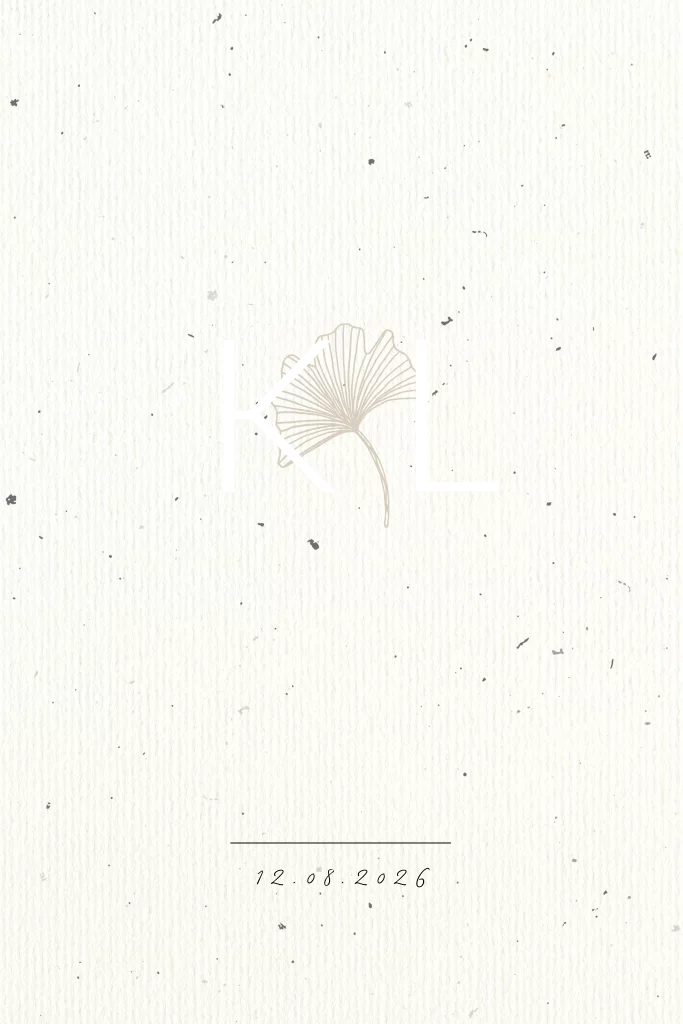 Een minimalistische trouwkaart met een ginkgo blad en een gevlekte achtergrond. De initialen op de voorzijde staan in goudfolie.