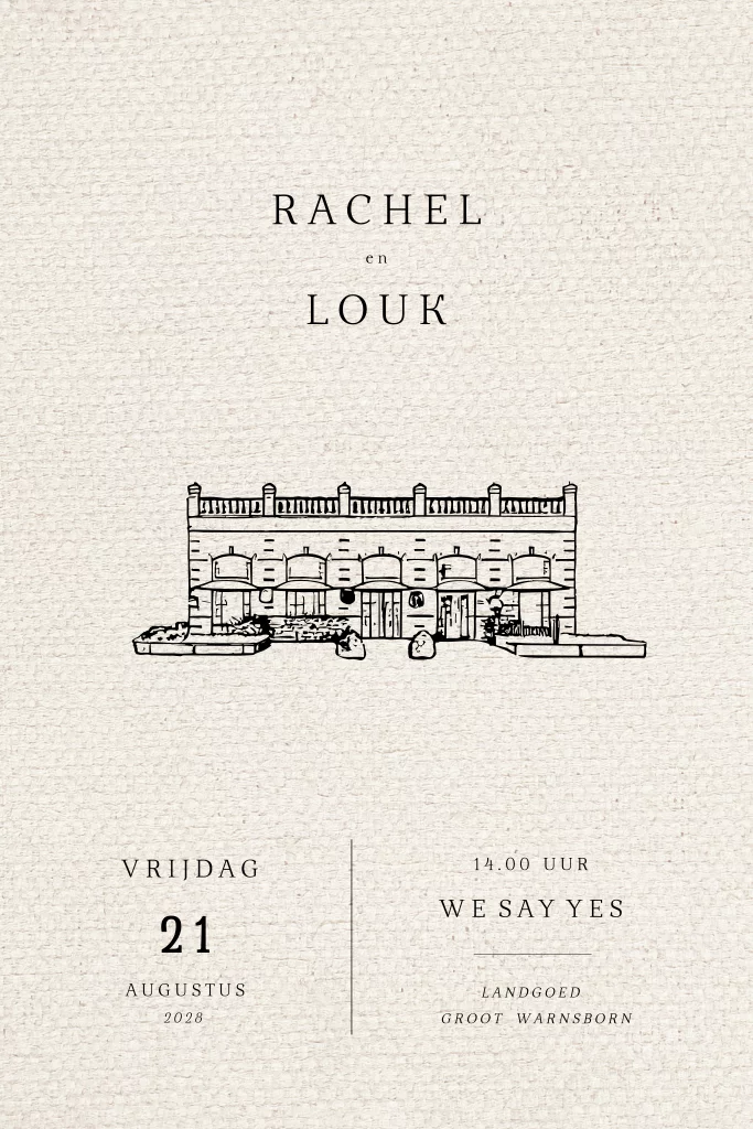 Romantische trouwkaart met linnen look achtergrond en een lijntekening illustratie van Landgoed Groot Warnsborn in Arnhem.