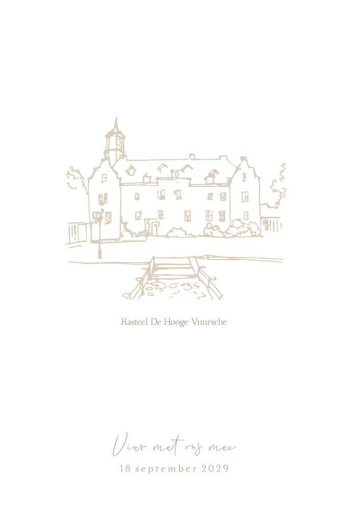 Romantische trouwkaart met een illustratie van Kasteel De Hooge Vuursche. Wil jij graag een illustratie van jouw trouwlocatie op de kaart? Mail ons voor de mogelijkheden.
