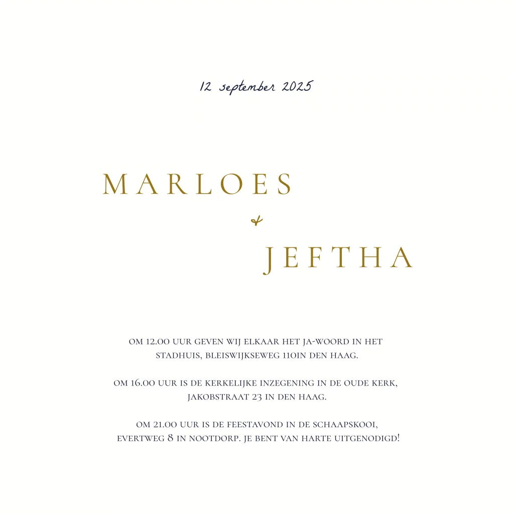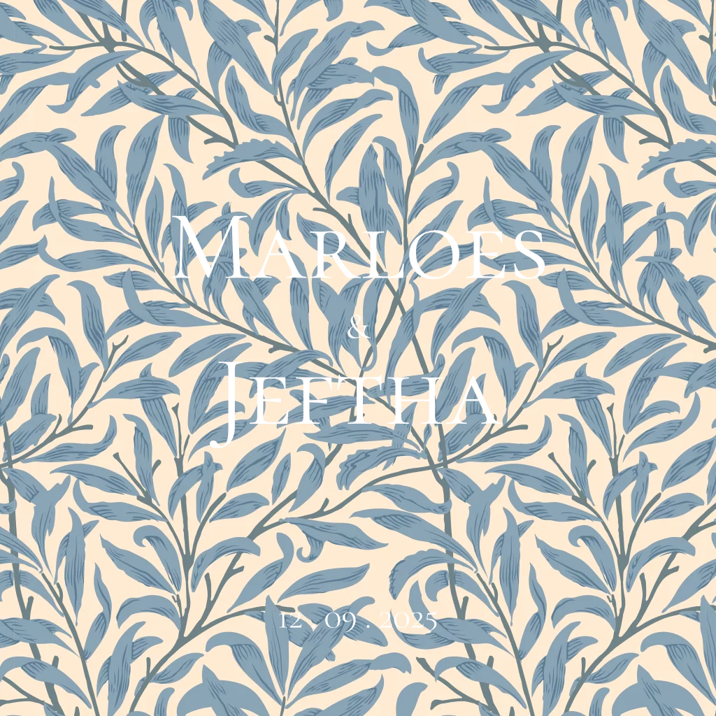 Trouwkaart met een romantisch lichtblauw bloemenpatroon en goudfolie naam op de voorzijde. De naam springt er prachtig uit op de romantische achtergrond. Deze kaart komt mooi tot zijn recht op linnen papier.