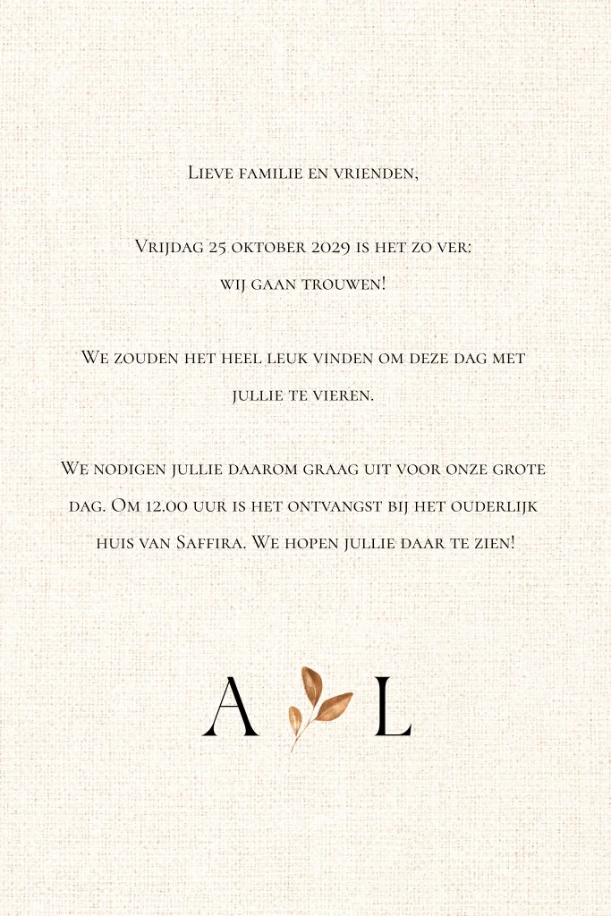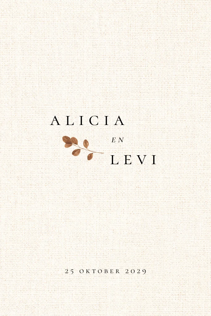 Minimalistische trouwkaart met linnen look achtergrond en takjes in de kleur brons / koper.