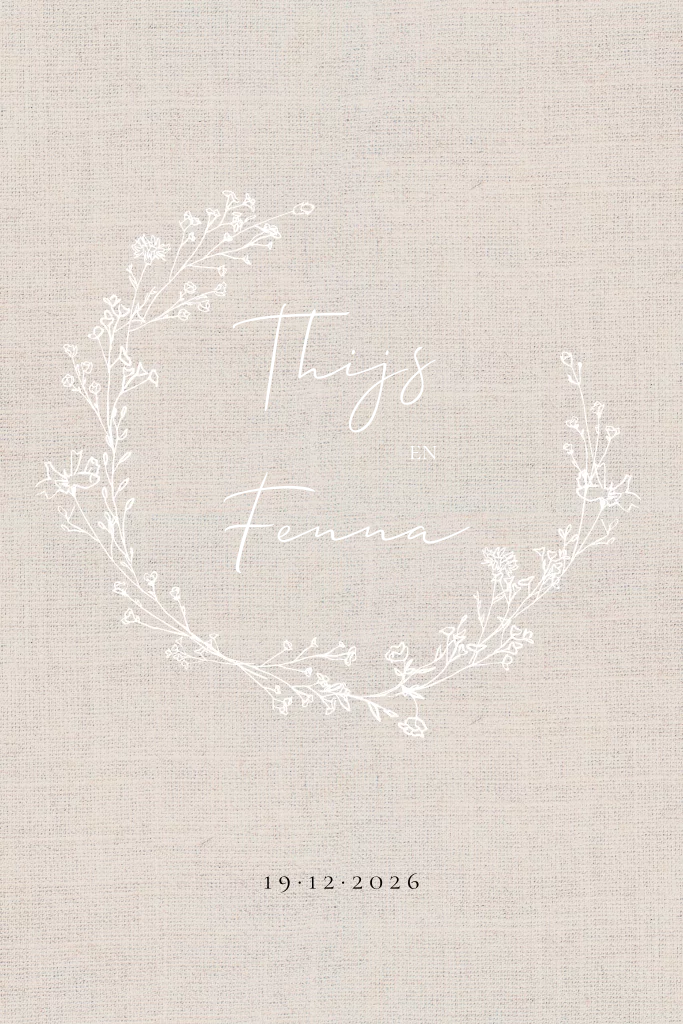 Trouwkaart met zandkleur linnen look achtergrond en een bloemenkrans het wit. Bij deze kaart adviseren we linnen papier.