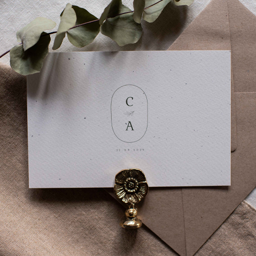 Minimalistische en hippe trouwkaart met de initialen in een trouwlogo met blaadje. De achtergrond van de trouwkaart heeft lichte vlekjes voor een origineel effect en eco look.