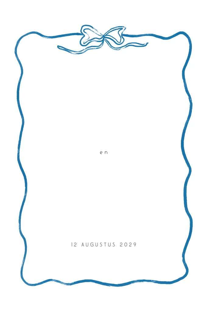 Mediterraanse trouwkaart met blauwe golvend frame en strikje. Passend bij bruiloften in de zomer, bij zon, zee en strand en bruiloften over de grens in bijvoorbeeld Italië, Frankrijk of Spanje.